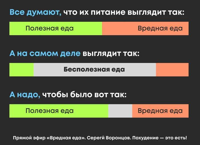 Чтобы в итоге а) меньше хотелось вредностей б) вредности могли поместиться в оставшиеся после НОРМАЛЬНОЙ еды. Приведу картинку, с одного из прямых эфиров, которую стараюсь почаще показывать: