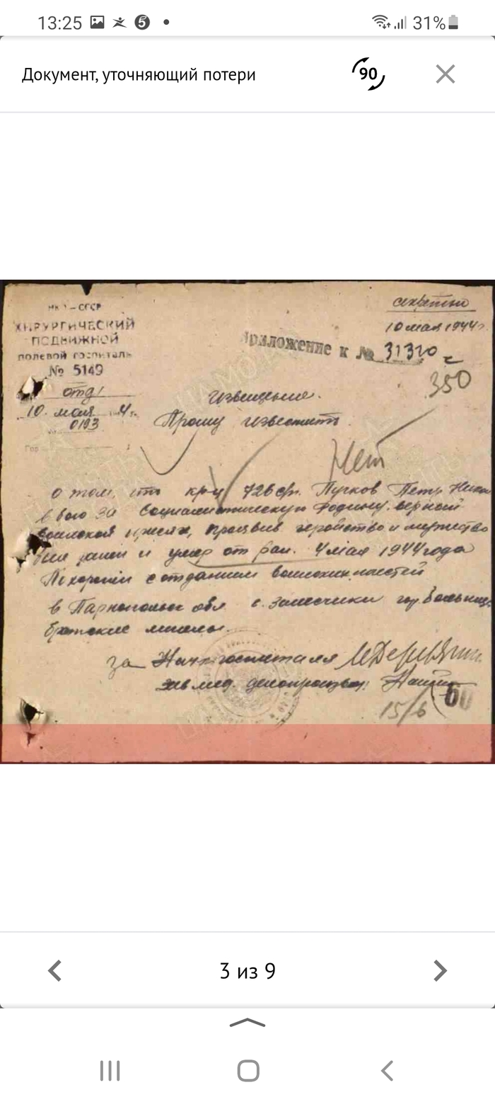 "Умер от ран, в мае 1944 года, в с. Залещики, Тернопольская область, на данный момент зап. Украина.
