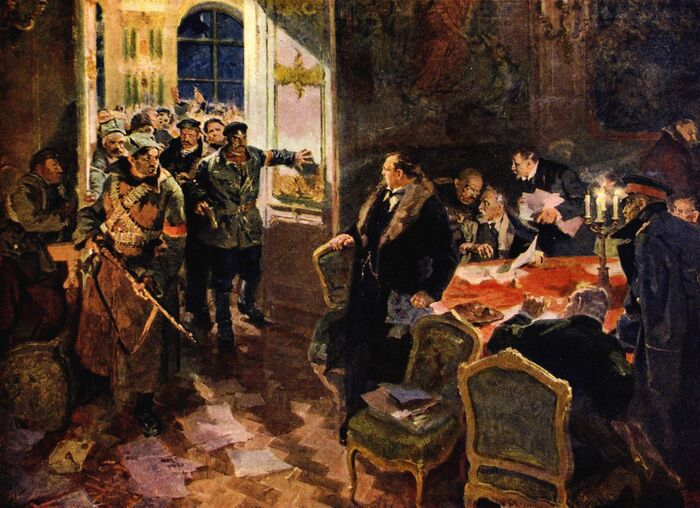 Состав свергнутого Временного правительства - шесть кадетов, один социалист-революционер, три члена РСДРП, два представителя трудовой группы, один независимый и два военных.