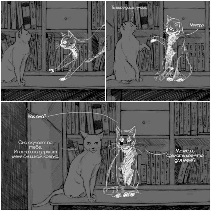 Он готов был бежать со всех лап к нему, но лапы уже его не слушались. Он во все глаза смотрел на хозяина, и поднял лапку. Их роли поменялись, теперь хозяин положил свою ладонь на окно и сказал: "Ты только дождись меня". Кот щурил глаза, и соседке показалось, что они наполнились слезами. Соседка закрыла переноску, и они с котом пошли домой. Кот быстро пошел на поправку, да и сосед тоже поправлялся.