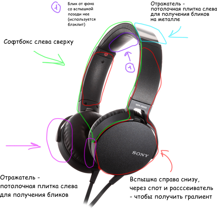 Приветствую всех! Решил дополнить свое портфолио фотографией наушников и рассказать вам как проводил съемку, какие источники света и для чего использовал, так как многие интересовали в предыдущих постах о схемах света.