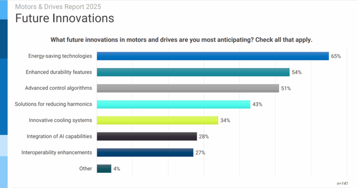 Респонденты ожидают в ближайшие годы энергосберегающие технологии моторов и приводов (65 %, как и в 2024 году), повышенную долговечность (54 % — без изменений) и продвинутые алгоритмы управления (51 % против 46 % в 2024 году). Если такие инновации уже предлагаются, информация о них не достигла целевой аудитории.
