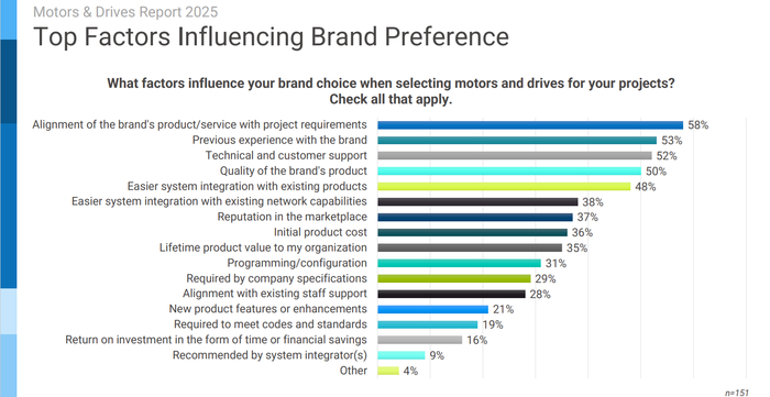 Более половины респондентов (53 %) назвали программирование или настройку главной проблемой при работе с моторами и приводами в системах управления, что на 4 % больше, чем в 2024 году. Другие значимые трудности — сложность управления (50 % против 46 % в 2024 году) и интеграция с существующей автоматикой и сетями (46 % против 47 % в 2024 году). Эти три проблемы оставались ведущими и в 2025 году, однако поставщики, улучшившие свои решения, не смогли донести их до потенциальных покупателей.