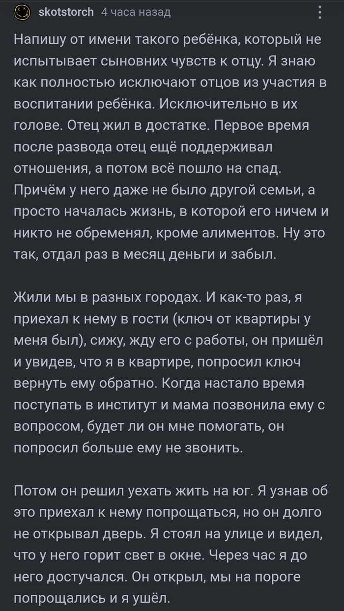 90е трудные, мама одна растит меня с братом и пашет в две смены, чтоб нас прокормить. кстати, не всегда получалось. Много было унижений..одежды новой у нас нет, обувь изношенная на 2 размера больше доставалась мне от тёти, дома поесть нечего было очень часто, что это уже было нормой поесть хлеб со сладким чаем на обед, придя из школы. Я часто ходила в гости к подружкам, а вдруг меня накормят. мне было очень стыдно в те моменты, но я ребенок, который хочет поесть просто хлеба с сыром.И, конечно же, называли безотцовщиной, вторым сортом и прочее прочее. А где был мой папа? Он жил в соседнем городе и растил других детей. помню приезжал раза 3 до моих 7 лет и только мать мою ругал, что дома неубрано. Странно да? когда же ей убираться, если работает и днем и ночью. Опустим все трудности, с которыми я сталкивалась в дальнейшей жизни, а кошмаров, связанных с отсутствием отца было много. Тут я выросла, выучилась, устроилась в жизни и мне уже самой под сраку лет и о, отец! Ему захотелось со мной поговорить. Что он мне сказал? Он сказал "Тебя твоя мать прятала от меня" Я все детство на улице как собака с утра до вечера торчала, как бесхозная собака, так сильно меня "прятали" от отца. Не было отца и нечего начинать.