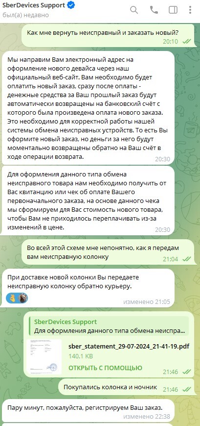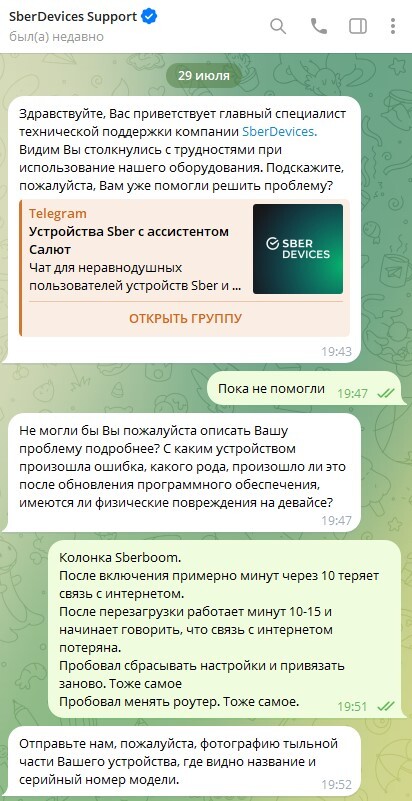 Обратился тут давеча с проблемой со сберколонкой в официальный телеграмм канал Sberdevices. Не прошло и минуты, как со мной связывается аккаунт Sberdevices Support.