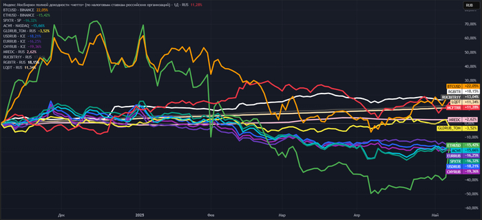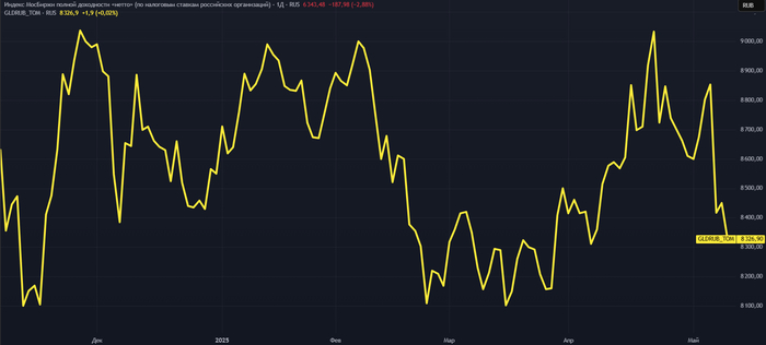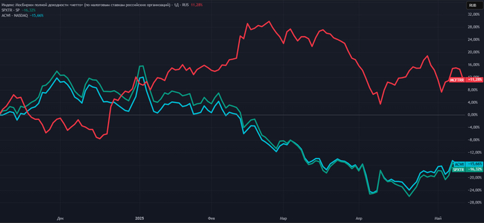 Как видно из графика американский и мировой фондовый рынок практически повторяют колебания друг друга, в отличии от российского. Так, на фоне эскалации торговых войн, инфляционных рисков, а также заявлений Трампа о возможной рецессии — SPXTR и ACWI с начала 2025 года уверенно пошли на снижение, добравшись до локального дна, уровня января 2024 года.