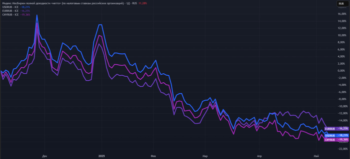 С начала 2025 года рубль имеет тренд на укрепление: здесь и преодоление негативных факторов конца 2024 года, и жесткая ДКП сыграла роль, и, конечно, позитивная геополитическая повестка + торговая война Америки дала свои плоды, даже евро в апреле начал укрепляться к доллару.