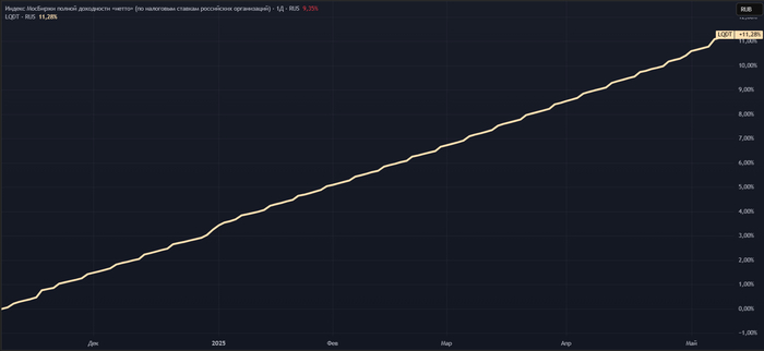 Доходность вкладов рассмотрим на примере фонда денежного рынка — LQDT, доходность которого зависит от значения ключевой ставки и, соответственно, показывает результат сравнимый со средней доходностью по вкладам.