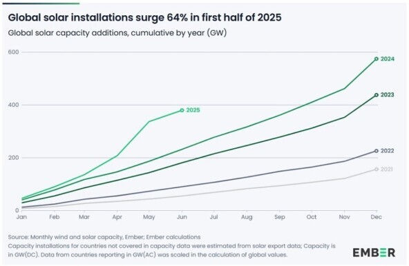 Мир в первой половине года добавил 380 ГВт солнечных электростанций +64% по отношению к прошлому году - 232 ГВт. Китай остаётся мировым лидером. В первой половине 2025 года количество установленных солнечных электростанций увеличилось более чем вдвое по сравнению с аналогичным периодом прошлого года. -согласно данным исследовательской компании Ember