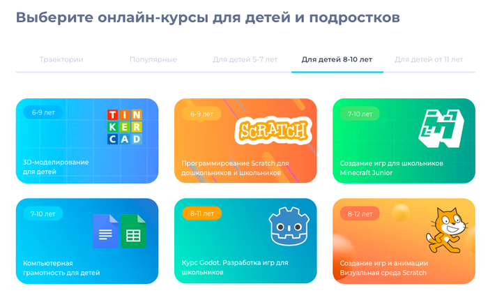 Здесь по причине того, что учебные способности и познавательные потребности ребят выходят на качественно новый уровень, онлайн-занятия для детей 8–10 лет охватывают куда более широкий перечень направлений. Примеры:
