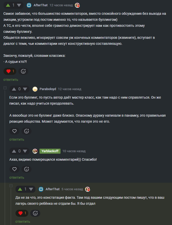 И, конечно же, тех детей и вожатых, которые позволят себе высказывания хотя бы похожие на комментарии под моим постом, сразу отправляются домой, не говоря уже о проявлении агрессии (физической или словесной) в адрес других участников смен.