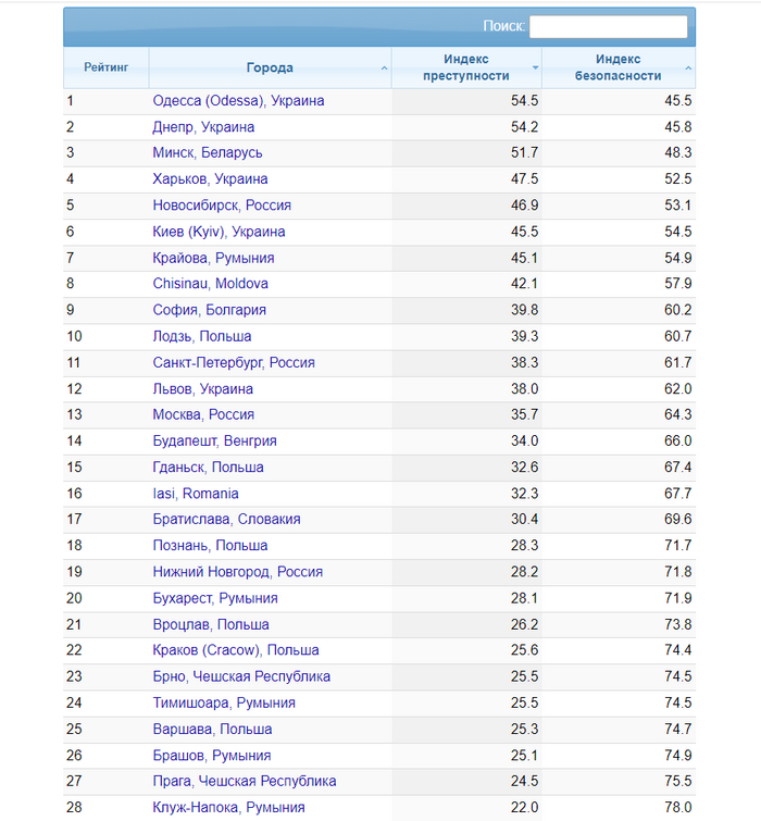 Вот таблица с 28 наиболее криминальными городами этого региона (хотя географически Новосибирск - это не Восточная Европа, но опустим это)