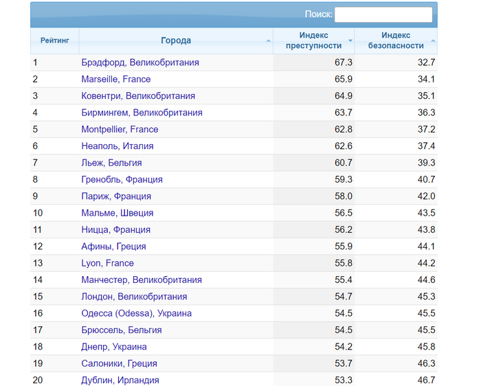 А вот список наиболее опасных городов всей Европы: