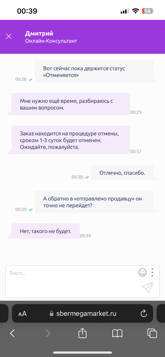 Действуя согласно этой справке 30.06.2023 мной, была предпринята попытка отмены заказа. Заказ переключался в режим «отменяется», однако через несколько часов снова возвращался на «отправлено продавцу» без какого-либо уведомления. Считаю, что данный «технический сбой» мог повлечь за собой серьезные последствия, поскольку, если бы я не проявил повышенной предусмотрительности, мой заказ мог бы быть подтвержден продавцом при моей полной уверенности что заказ отменен.
