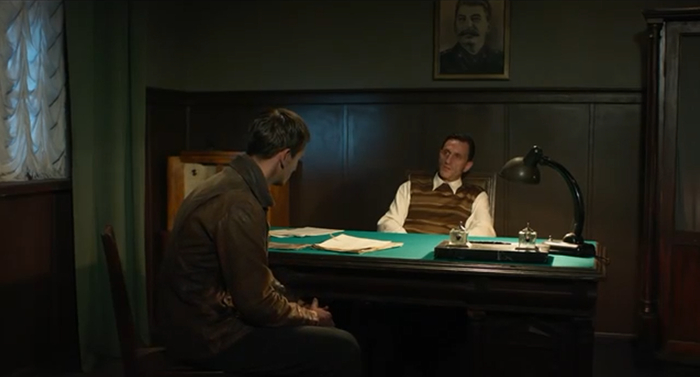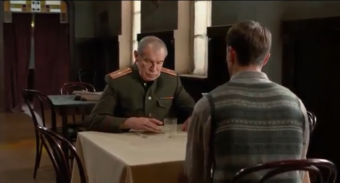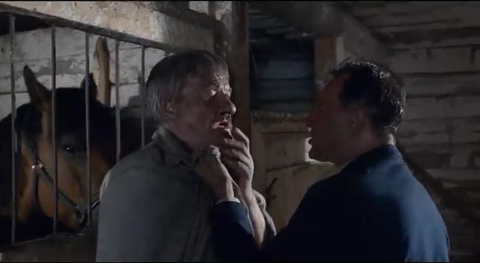 Ну а злобный упырь из МГБ, начинает избивать и допрашивать старика, живущего на этот хуторе, на предмет где скрываются бандиты и куда делись оперативники, посланные на этот хутор ранее.