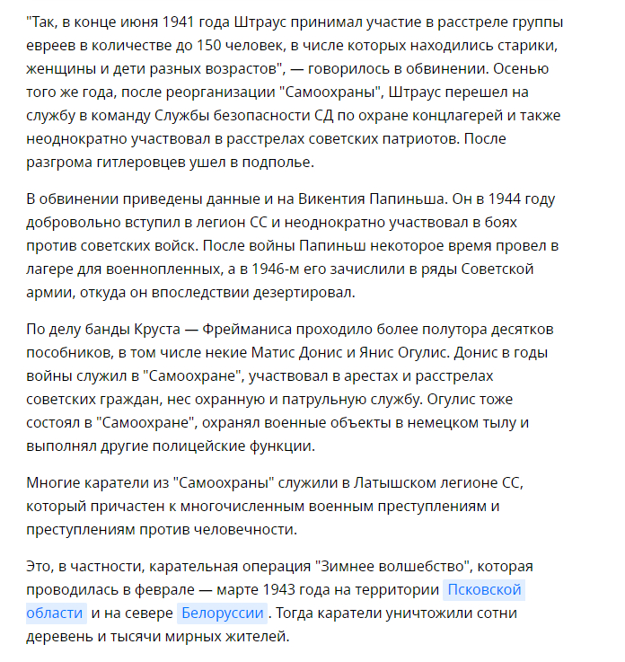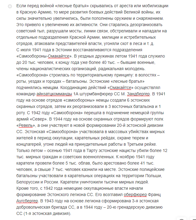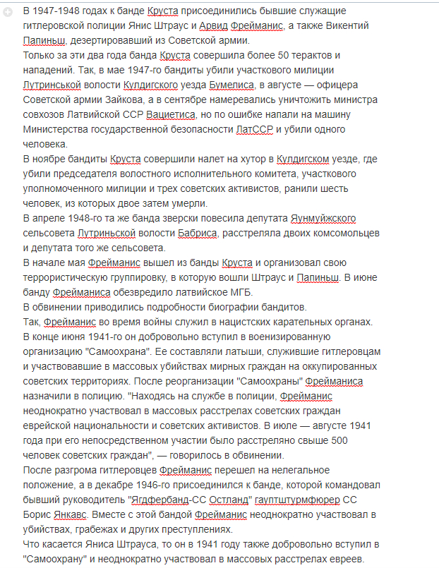 Латышские каратели, в годы Великой Отечественной войны в рядах эсэсовцев участвовавшие в геноциде мирных граждан, после войны объединялись в банды "лесных братьев" и под руководством бывших гитлеровских диверсантов продолжали систематический террор в отношении жителей Латвийской ССР.