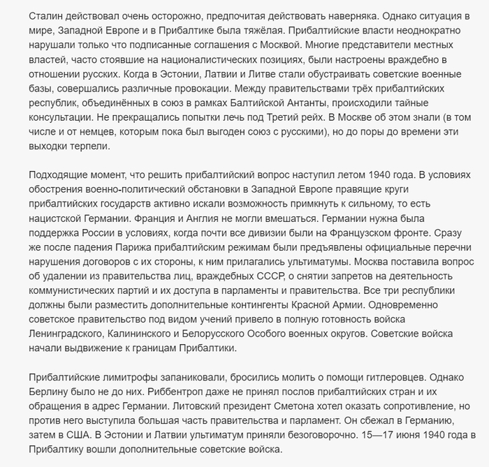 Главный специалист научного отдела Российского военно-исторического общества (РВИО) Никита Буранов считает, что ввод советских войск в Эстонию и Латвию - 17 июня 1940 года - и последующие выборы парламентов, которые приняли декларации о вхождении в состав СССР, нельзя назвать оккупацией.
