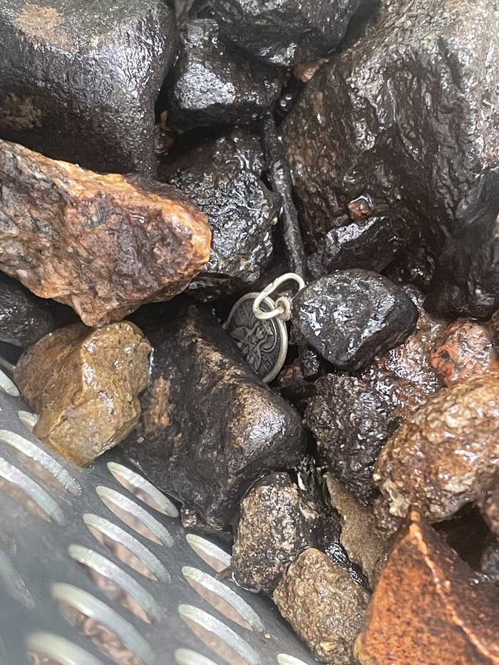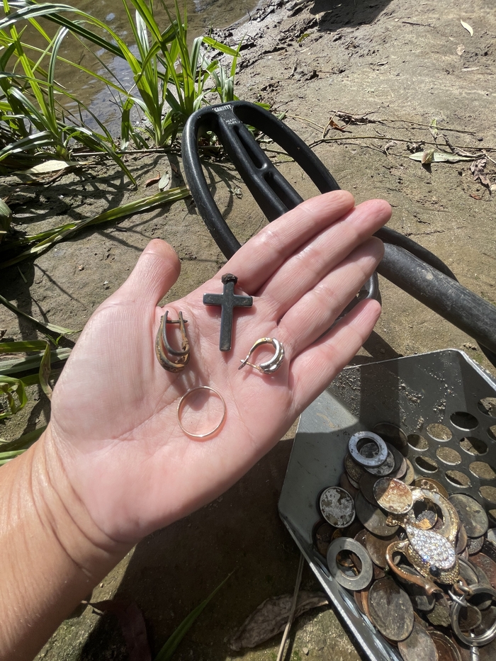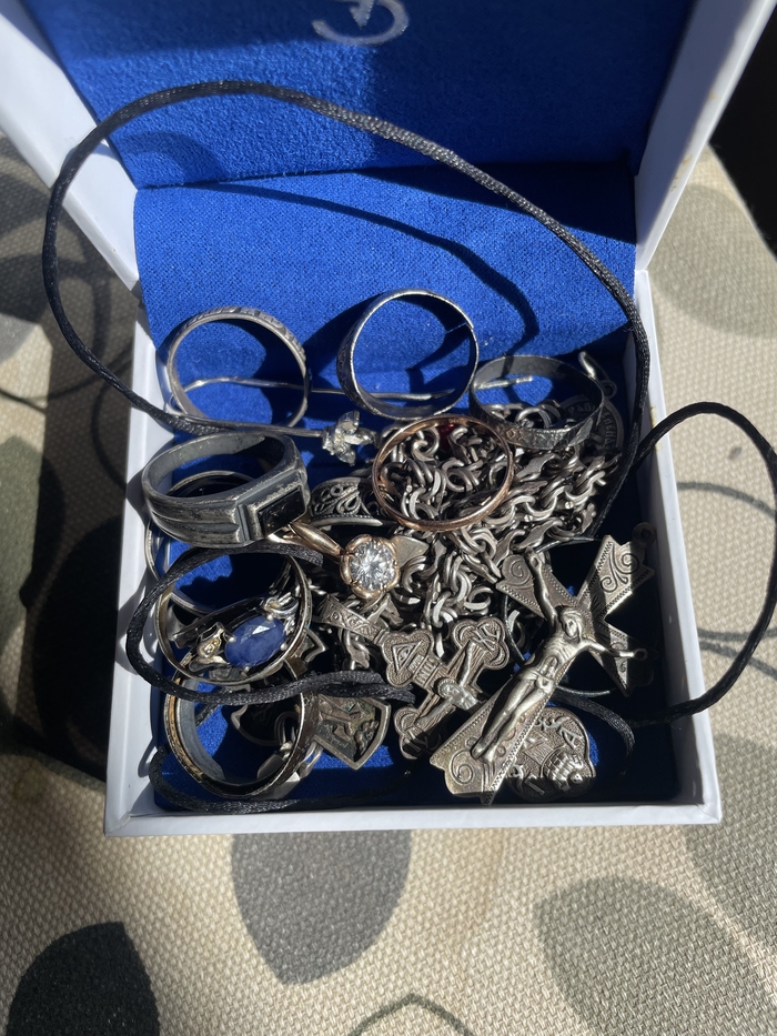 Сегодняшний выход мало обещал хорошего, так как проходил без солнца, с накрапывающим периодически должником и в весьма прохладную погоду (при плюс 15 в среднем), но все же он принес свои результаты: 50 рублей современной мелочью, чей то вейп, мужские убитые часы, бижутерный крестик и заветный подвес с Богоматерью 925 пробы, который можно считать вымученным ценой героических усилий.