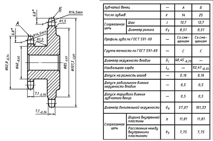 Если звездочка имеет несколько зубчатых венцов, которые отличаются друг от друга количеством зубьев или шагом цепи, то значения параметров для каждого венца указываются в отдельных графах таблицы параметров.