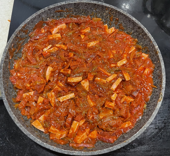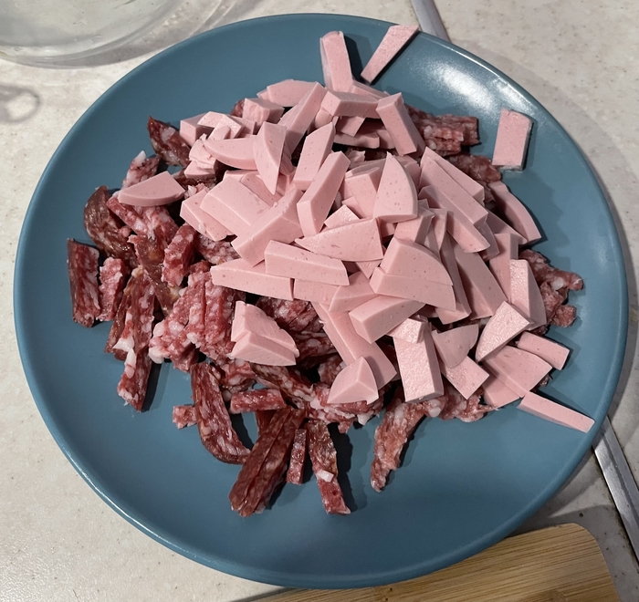5) добавил в зажарку нарезанную колбасу 3 вида по 100 грамм
