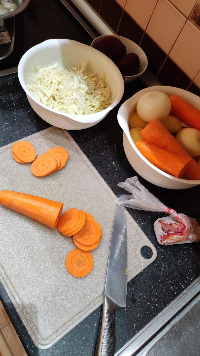 Дальше чистим и режем овощи. Лук, морковь, свёкла, капуста. В пакетике замороженная зажарка для борща с прошлого раза. Рекомендую заготавливать и замораживать многие продукты. Достал, разморозил, время сэкономил.