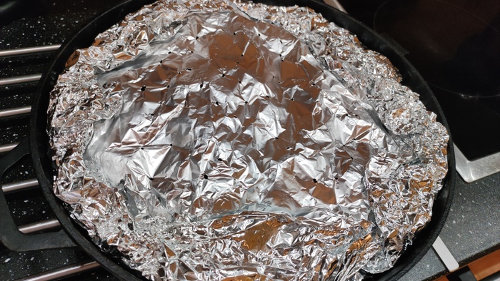 Заворачиваем фольгу, делаем дырки зубочисткой, чтобы вода испарялась