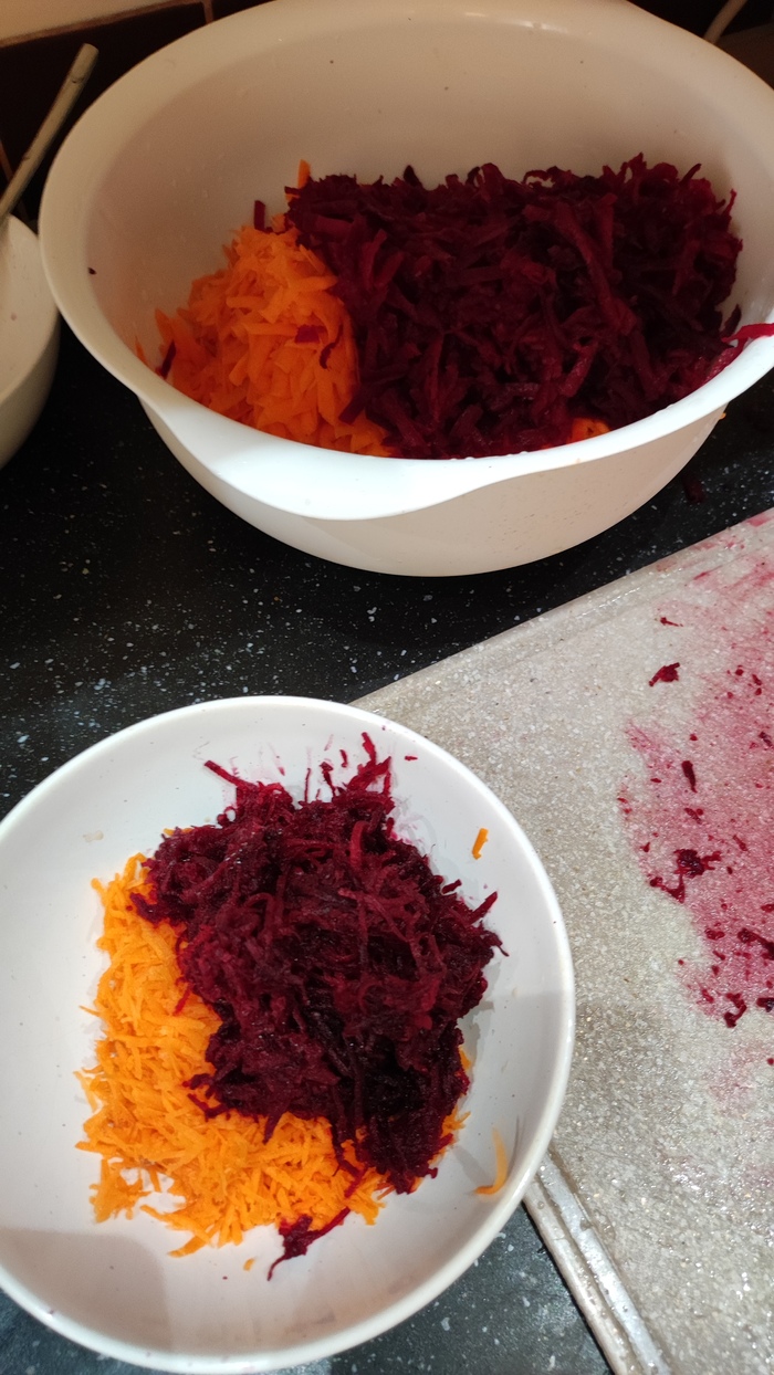 Ну и засекаем снова примерно 40 мин и оставляем булькать. мясо в тарелке, полуборщь булькает можно перекурить и сходить к одинокой соседке попоросить у нее терку если вдруг у Вас ее нет. Если есть то можно попросить кровь девственницы пожаловавшись что пытаетесь сварить первый в своей жизни борщ и она крайне необходима. Вы естественно выслушаете стопицот советов по правильному приготовлению настоящего борща а не того томатного супа что Вы пытаетесь сварганить. и если повезет то Вы получите борщ под номером 3 из моего рейтинга. терку и замечательный как минимум вечер))) А если не повезет получите теркой((((. Ну в общев моем - чистим свеклу морковь. Трем на крупной терке в одну посуду и засыпаем в кастрюлю. Вот теперь можно посолить. солим перемешиваем варим так же на среднем огне. пока идут засеченные нами 40 мин от засыпки картохи капусты можно отмыть терку и емкость куда терли, разделочную доску ну и что там у Вас еще накопилось.