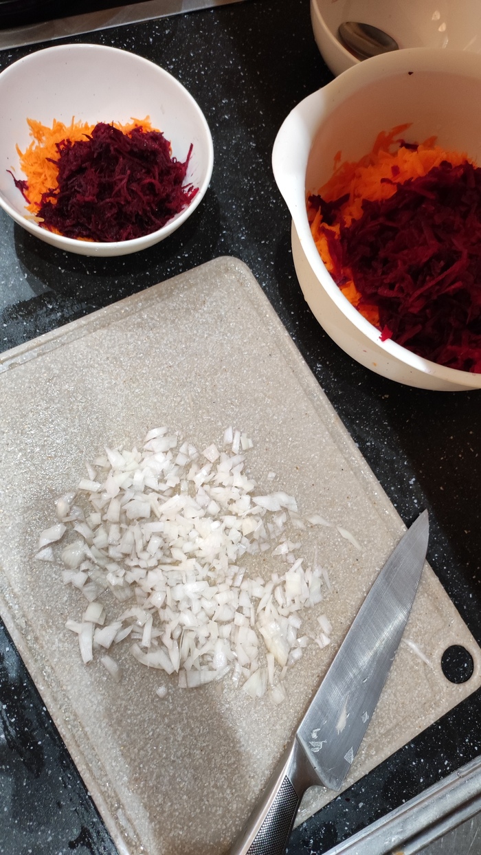 Дальше шинкуем капусту, морковь, свёклу, кромсаем лук. На мелкой терке для зажарки, на крупной для салата (салат для мужиков полезен, потом расскажу). Половину лука в кастрюлю, потом выкинем.