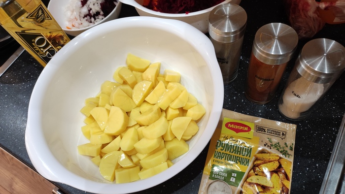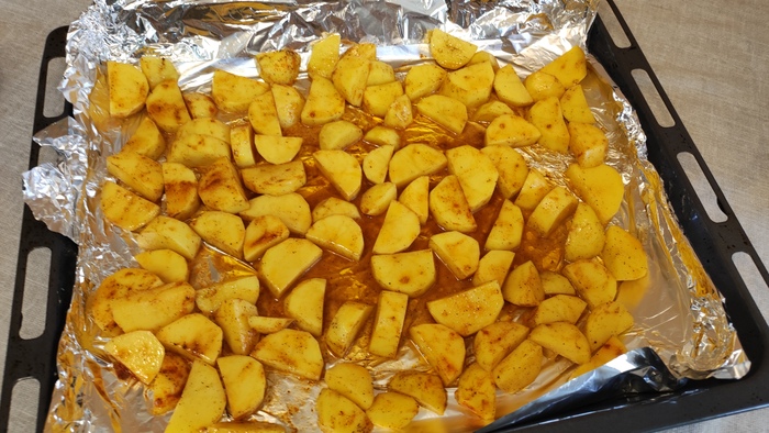 Берём картошку, поливаем немного маслом, специи по вкусу (соль, перец, парика или готовая для картошки), перемешиваем.
