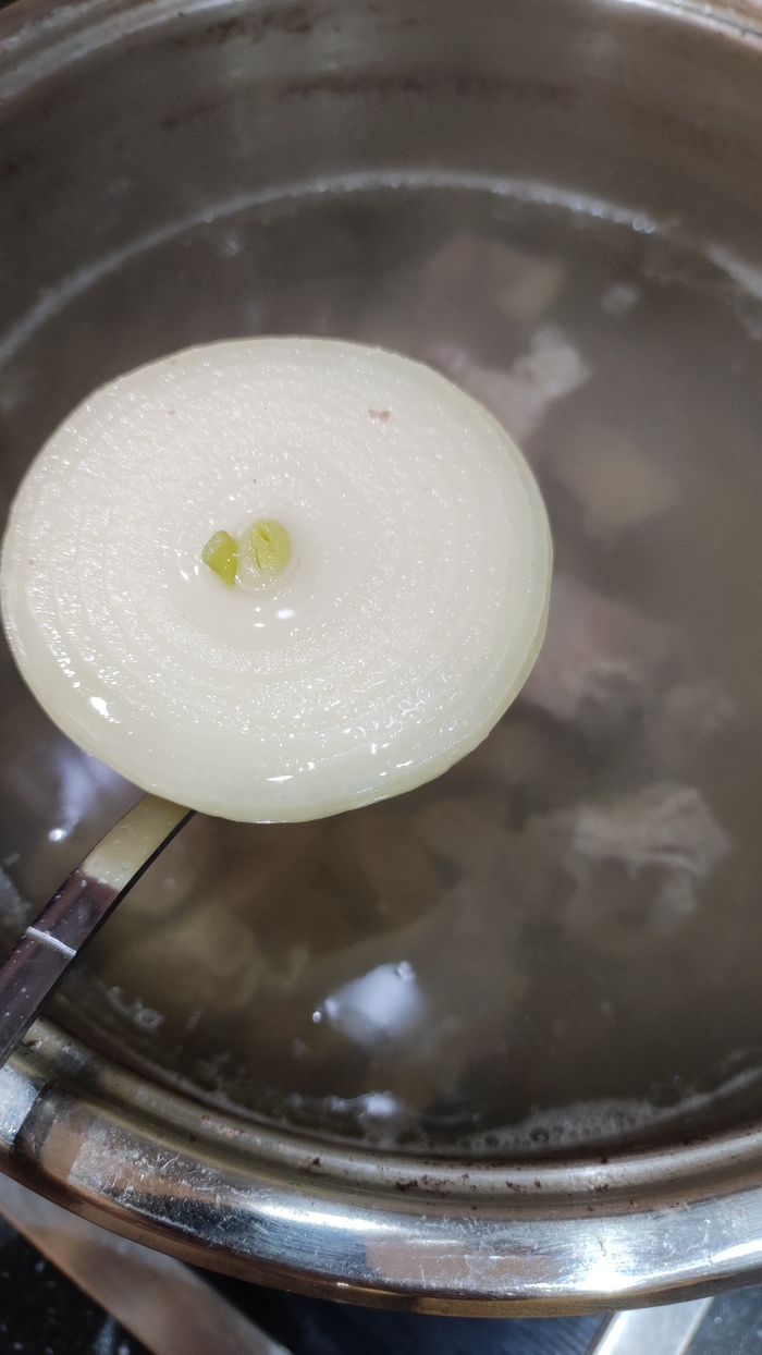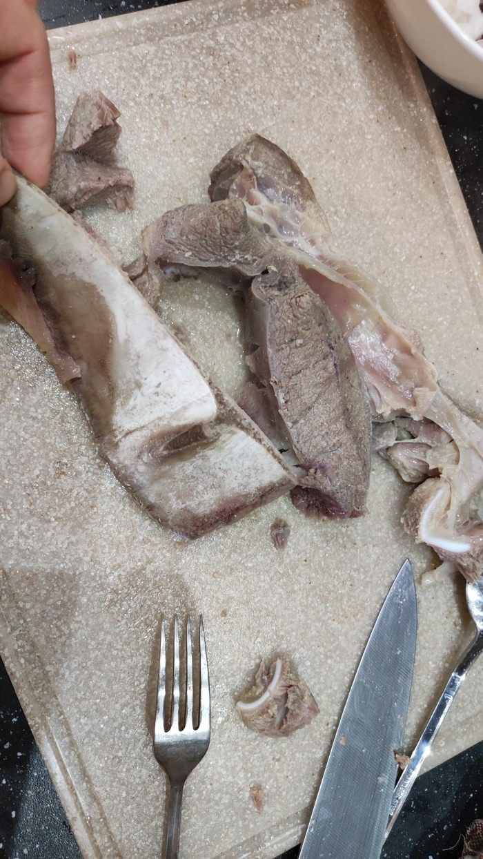 Далее достаем лук из кастрюли и выкидываем. Достаем кость с мясом, мясо отходит без усилий. Кость выбрасываем, мясо режем и обратно в кастрюлю. Смотри не перепутай ©🤣