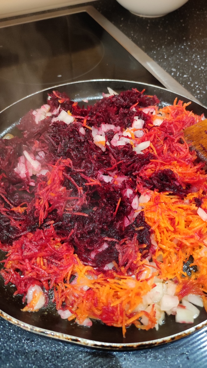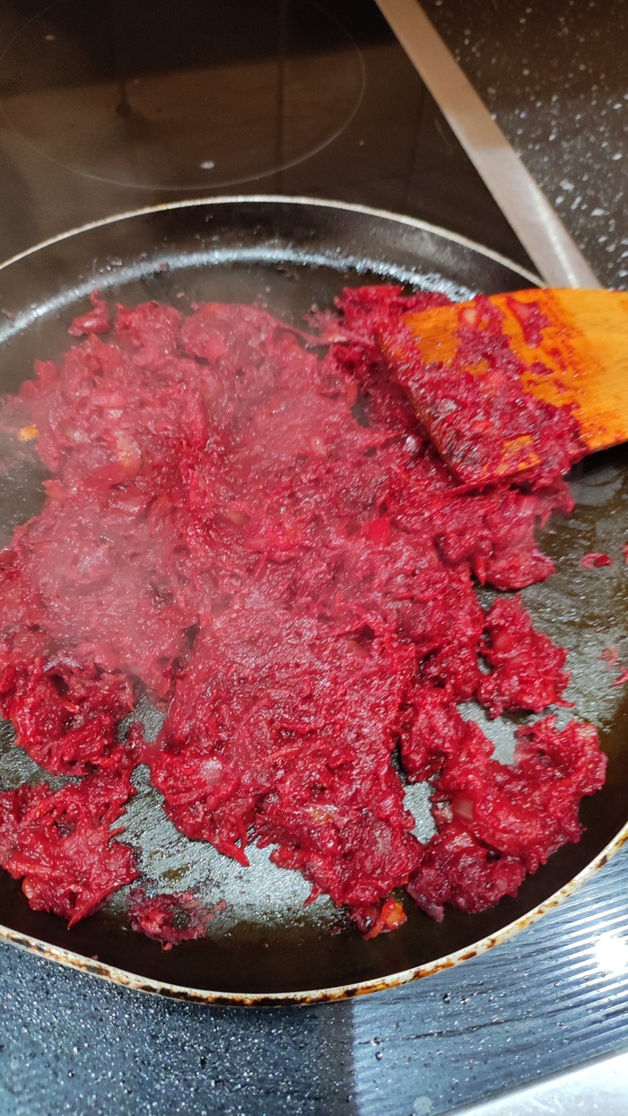 Далее фигачим зажарку. Кусок сливочного масла на сковороду, потом вываливаем всё вперемешку (свёкла, лук, морковь), две или три столовых ложки томатной пасты, чайную ложку соли, две чайных ложки сахара. Обжариваем на среднем огне, до состояния каши (не пережарьте, если что не беда и так сойдёт)
