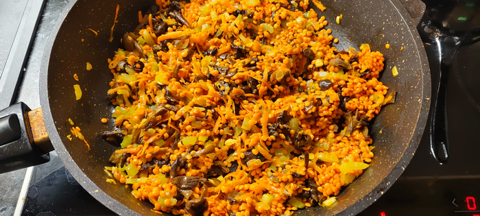 Опята ( отваренные), лук, морковь, сельдерей, чеснок, красная чечевица, прованские травы, парика, смесь перцев, масло и соль.
