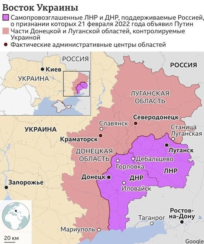Украина не признаёт ДНР и ЛНР государствами, а рассматривает их как террористические и сепаратистские организации, марионеточные государства, организованные и вооружённые Российской Федерацией, которые при поддержке российских войск незаконно захватили и удерживают украинскую территорию. Территории, контролируемые ДНР и ЛНР, в соответствии с украинским законодательством считаются временно оккупированными Россией.