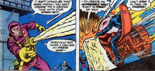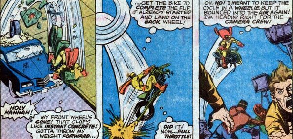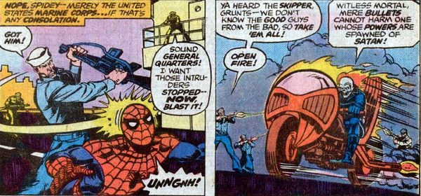 Мотоцикл идёт кубарем, у него отваливается колесо. Одной только сноровки каскадёра тут не хватит – Джонни превращается в Призрачного Гонщика. Но дела всё ещё плохи – мотоцикл совершенно неуправляем и на полной скорости несётся в толпу людей. Вариантов немного – или давить людей, или выруливать в стену (а на такой скорости даже отродье Ада костей не соберёт). Впрочем, на помощь Гонщику приходит Человек-Паук, остановив и Гонщика, и мотоцикл своей паутиной- Но тут самого Паука похищают, обвязав сверхпрочной клейкой жижей. Не задался денёк!