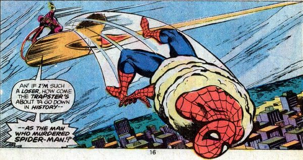 Поняв, что пора перейти в контратаку, связанный клеем Спайди кое-как запрыгивает на летучую платформу, откуда Трапстер собирался сбросить его с приличной высоты, и пытается навешать Трапстеру люлей. Это сложно из-за крепко связанных рук. Ослепив Человека-Паука вспышкой на своём ремне, Трапстер сбрасывает-таки его с платформы. С большой высоты. Но это видит Призрачный Гонщик – и он не намерен дать своему другу так просто погибнуть.