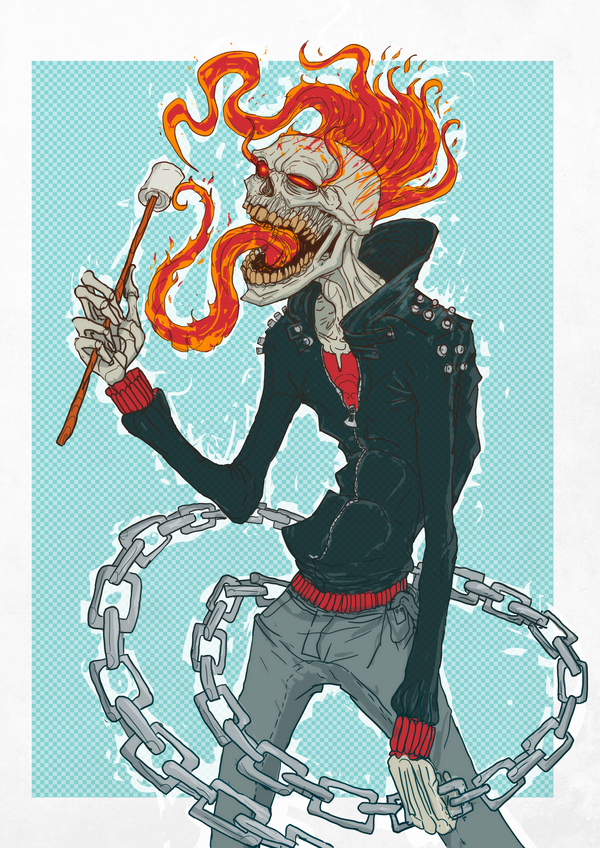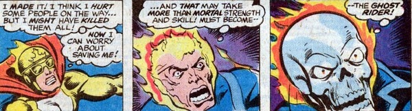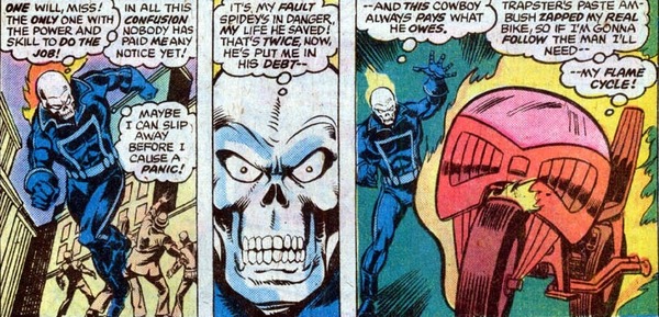 Чтобы спасти Человека-Паука, Гонщик использует приём, который подсмотрел у другого известного героя (и своего тёзки) – Джонни Шторма, Человека-Факела. Врубив адский огонь на полную катушку, он начинает ездить кругами, пытаясь создать воздушную подушку. Неблагодарный Паук, впрочем, начинает жаловаться на излишнее потепление. Зато уже на земле, упав в крепкие (пусть и несколько костлявые) руки Гонщика, Паук избавляется от клейких оков.