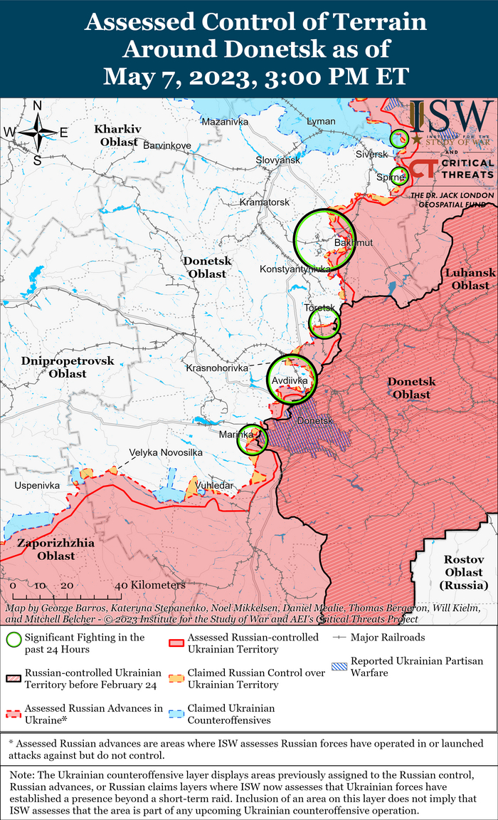 По состоянию на 7 мая российские войска добились определенных территориальных успехов в Бахмуте и продолжали ограниченные наступательные действия на фронте Авдеевка-Донецк.