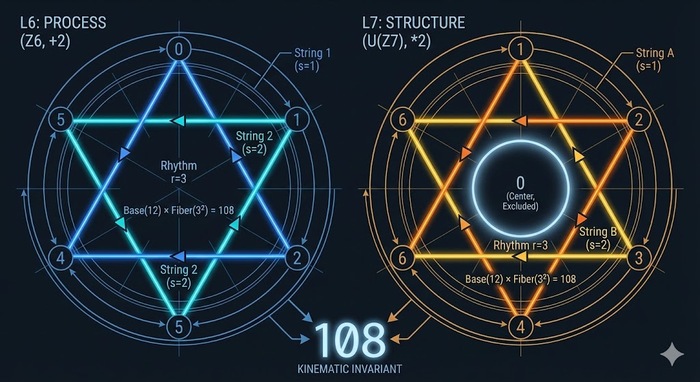 Мне стало интересно: можно ли получить это число строго математически, как неизбежное следствие архитектуры системы? Я взял «бритву Оккама», отсек все лишнее и построил простейшую модель двигателя на кольцах вычетов. Результат меня удивил: 108 — это не случайность. Это кинематический инвариант перехода от Времени (Процесса) к Смыслу (Структуре).