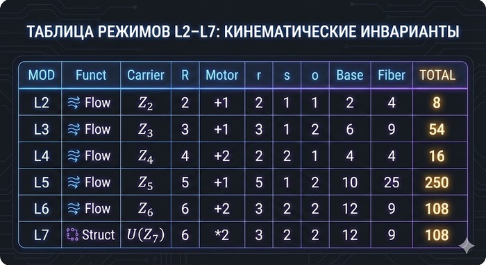 Пояснение по L4: Z_4 допускает моторы порядка 4 (например +1), но атомарный ритм по A2 — r=2. Тогда h = (+1)^(4/2)=+2, ord(h)=2, и по A4 o=1. Поэтому TOTAL=16 железобетонно.