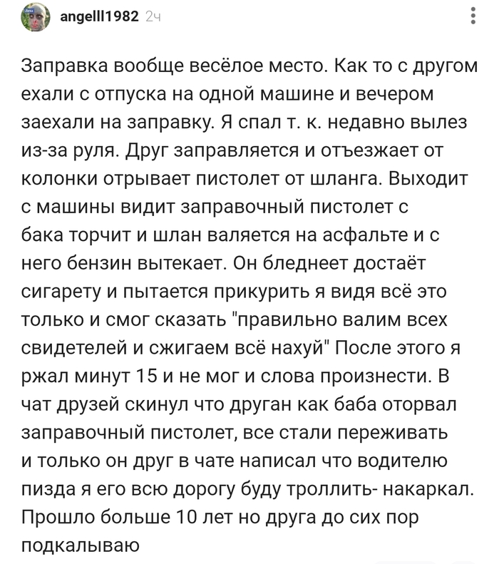 1 abcdabcd1956 Скриншоты комментов Юмор Прошло более 10 лет но друга до сих пор подкалываю !!! 5 часов назад #comment_381884120 Показать полностью 1 Скриншот Комментарии Комментарии на Пикабу Заправка Авто Бензин Сигареты Юмор Смех (реакция) Чат Заправочный шланг 4 1 1 Ещё 0