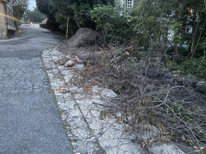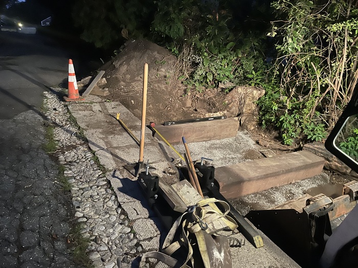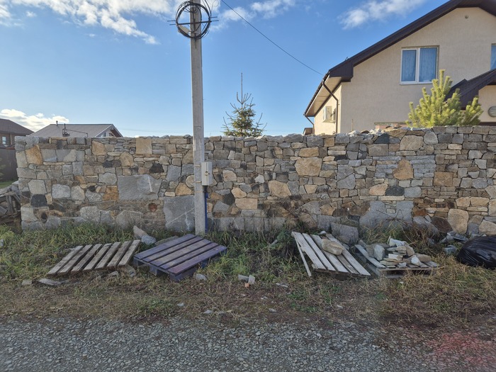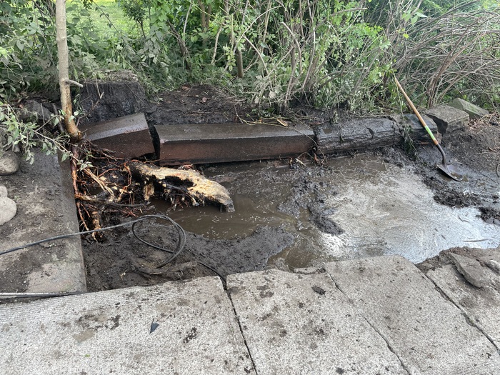 Чтобы понять глубину проблемы, керхером очистил пень от земли. Кстати, рекомендую - очень удобно, если есть куда воду сливать. Тут как раз нужный уклон был. В процессе обнаружились еще и офигенные каменные балки/поребрики, которые прям отлично вписывались в мой проект пухты. Однако одна из балок была вся опутана корнями, так что стало понятно, что малой кровью обойтись не получится.