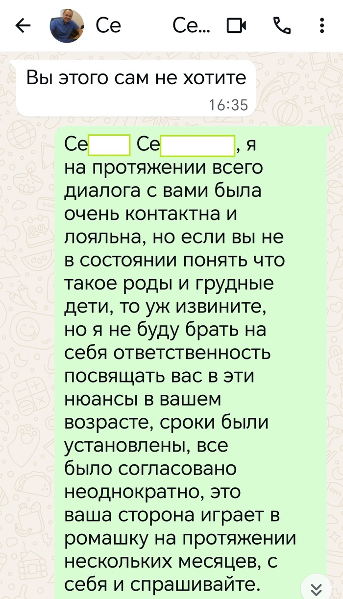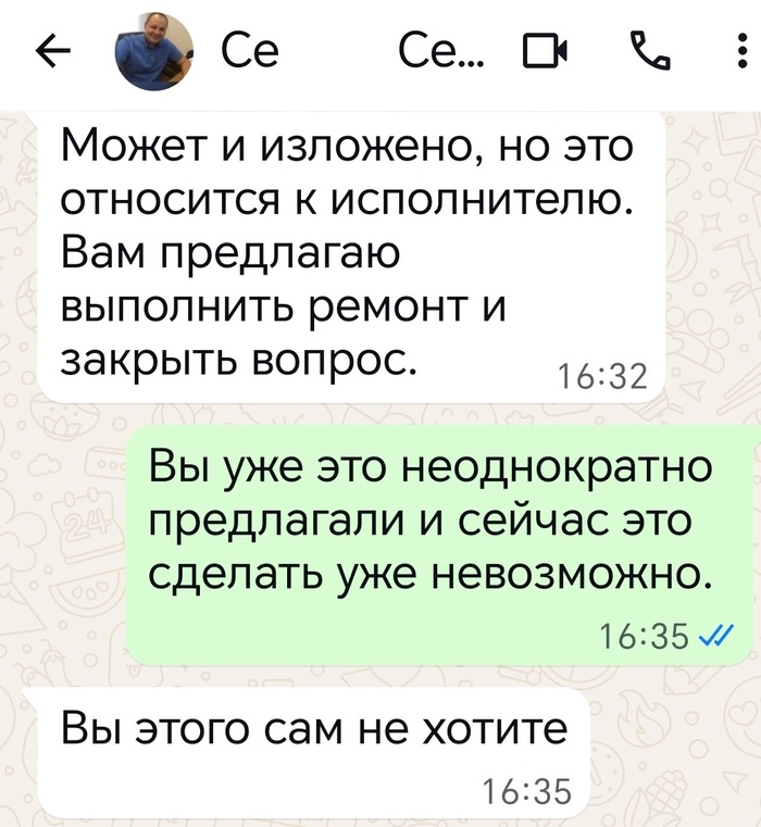 Срок устранения недостатков был обозначен не позднее 12.09.2025 в силу приближающихся родов. Спустя 10 дней после написания претензии к нам направили технолога от компании, который точно так же как и прошлый сотрудник, посетивший нас неоднократно, занимался замерами трещин, дыр, отверстий, осуществлял фото и видео съёмку и также озвучил нам о возможном частичном устранении недостатков, если мы часть работ возьмем на себя. Был составлен очередной акт, после чего технолог уехал.