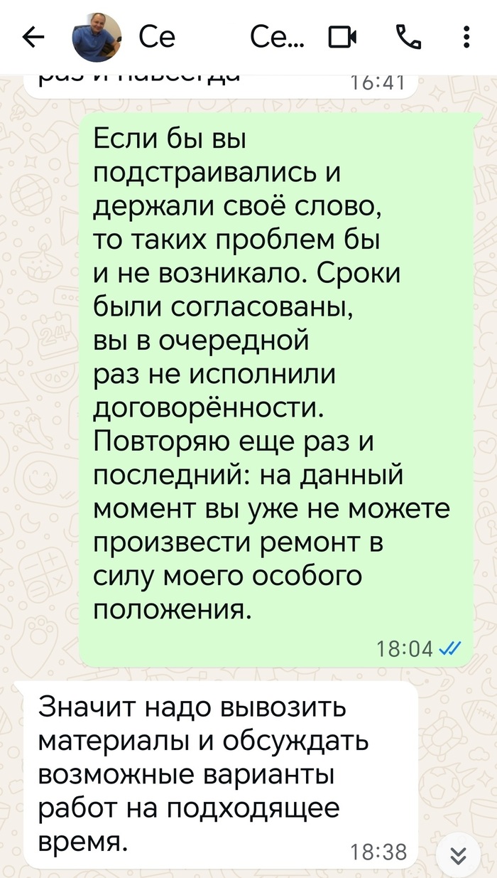 А 16.09.2025 компания завезла материал и приехала бригада, несмотря на то, что это не укладывалось в сроки обозначенные в претензии, но мы снова пошли навстречу компании, хотя нас уже ждали в роддоме. Но как оказалось, перечень работ с бригадой согласован не был. И что для устранения недостатков нужно в три раза больше времени, чем озвучивал представитель компании. Помимо всего прочего необходимо произвести демонтаж всей эл. проводки, но допуска к электромонтажным работам у бригады нет, а демонтировать проводку под свою ответственность они не стали. Представитель компании с ними не смог договориться, в итоге спустя пол дня разбирательств бригада уехала, отказавшись работать за те деньги и на тех условиях, что им предложил представитель компании.
