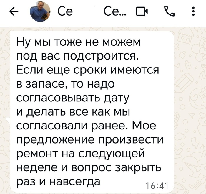 Спустя несколько дней снова объявился представитель компании, который предложил нам согласовать новую дату захода бригады, что в целом нас уже не интересовало т.к. такой возможности уже не было.