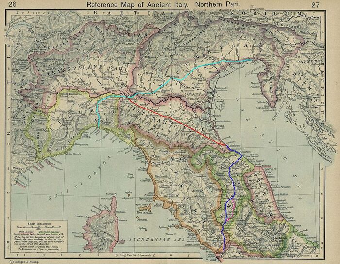 Дорога Виа Постумиа (синий цвет) – часть дорожной сети Древнего Рима в северо-восточном направлении. Последовательность: начиная с Рима: Фламиниева дорога (синий цвет ), за ней следует Эмилиева дорога ( красный цвет ) , которая соединяется в Пьяченце с Виа Постумиа, заканчиваясь в Аквилее на востоке и в Генуе (запад).