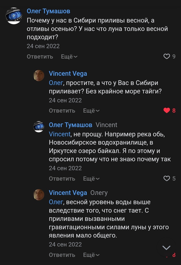В общем, друг прислал статью почитать про амфидромические точки и коитальные линии (статья на всеми любимом Дзене, по этому сюда ссылку постить не буду, кому интересно будет, легко гуглится по названию топика), так вот суть статьи в том, что есть точки на планете, где нет приливов и отливов и в целом вода ведёт себя странно, как-то булькает, пенится и бурлит в своём там океане. Честно говоря боялся, что это всё закончится "и вот это вот всё ясно свидетельствует нам о том, что земля плоская", но там автор зашёл с другого боку и предположил некие потоки гравитационного эфира. Но, немного углубившись в вопрос, я так понял, что всё эти "аномалии" связаны с тем, что гравитация Луны воздействует не на воду, а на земную кору.