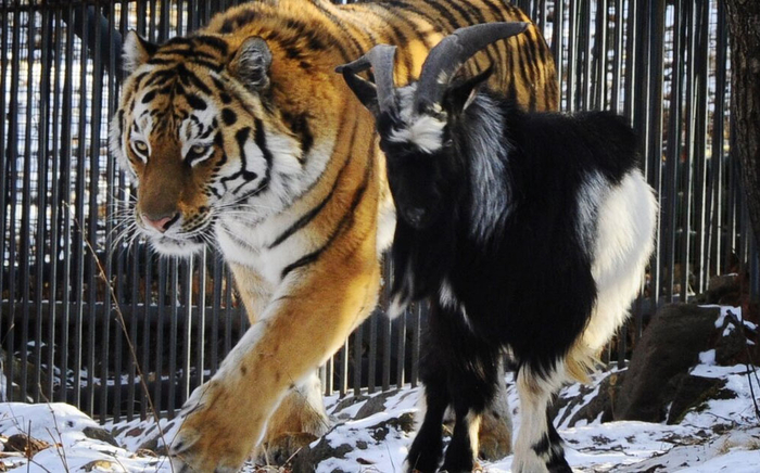 Нет, тигр не пытался съесть козлика, который вообще-то изначально как раз и был выдан на обед большой кошке, но в конце концов этот обед обозрел настолько, что слишком высоко поднял тигру нерв, в результате чего тигр спихнул козла с возвышенности, и тот уехал поправлять резко пошатнувшееся здоровье.