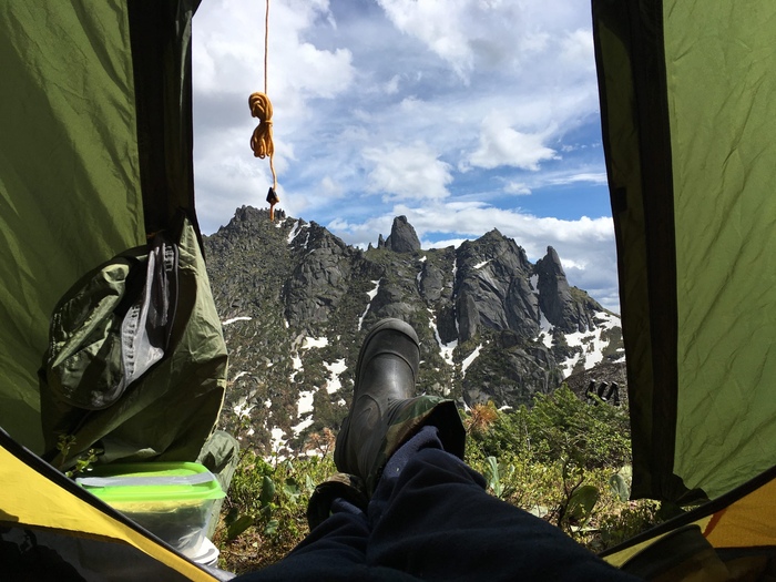 Находим полянку в стороне от основных мест обитания местных и наслаждаемся отдыхом. Долго купаемся, плаваем, моемся, всё ещё не веря своей удаче. Признаться, на такой подарок судьбы сегодня мы точно не надеялись. Потом я сажусь за отчёт, а Ирина развлекается ловлей мелкой рыбёшки ради спортивного интереса.
