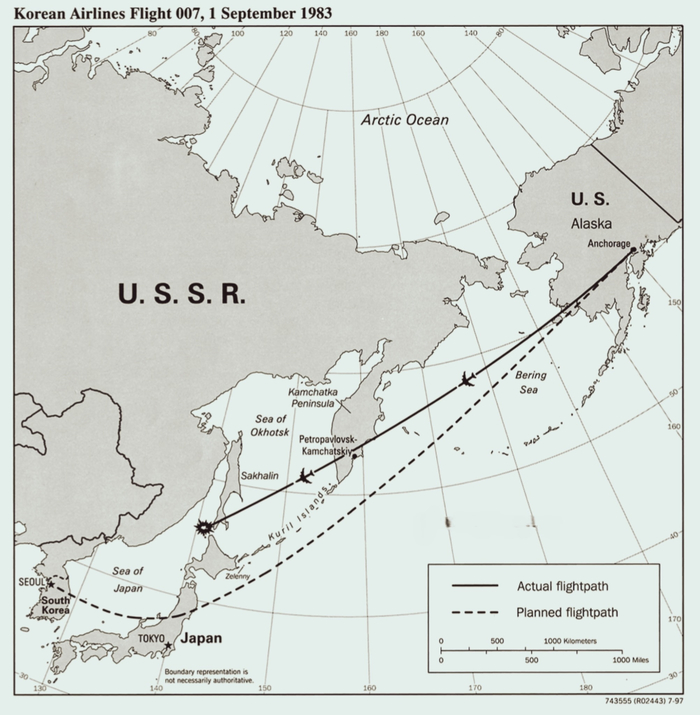 Плюс маршрут KAL 007 проходил точно над секретными объектами: военными базами и радарными станциями. Случайно ли самолет "заблудился" именно туда?