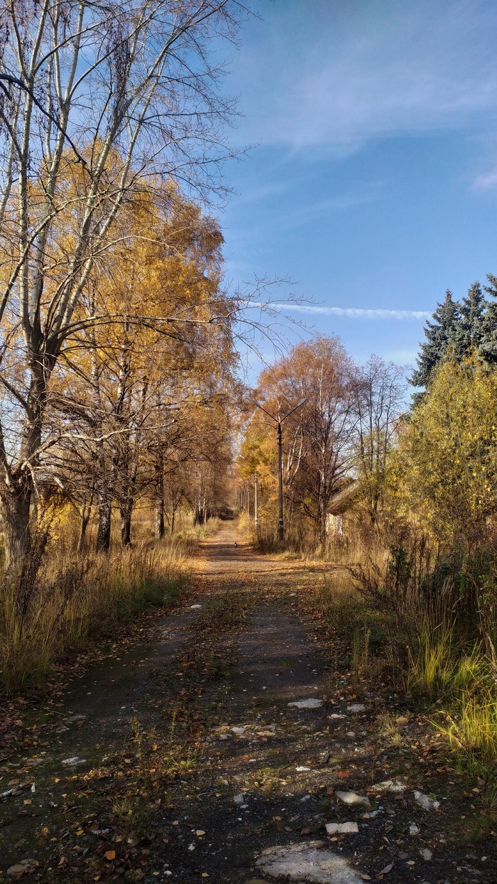 Не знаю, как у вас, а я нахожу какое-то щемящее очарование в осенних пейзажах средней полосы. А тут прямо комбо - мертвый город, увядающая природа, тишина... Мысли приобретают некую возвышенность, взгляд устремлен одновременно и окрест, и внутрь себя. Странное состояние, но мне нравится.